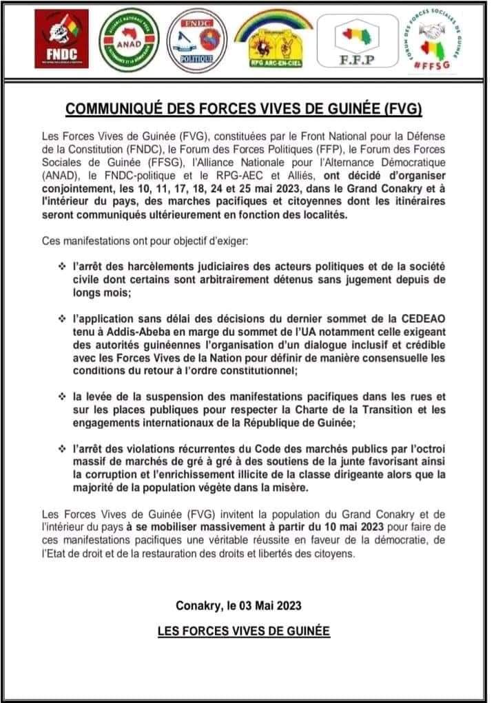 COMMUNIQUÉ DES FORCES VIVES DE GUINÉE (FVG) Les Forces Vives de Guinée (FVG), constituées par le Front National pour la Défense de la Constitution (FNDC), le Forum des Forces Politiques…
