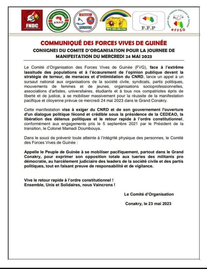 Reprise des manifestations NEWS RELEASE FROM THE FORCES VIVES OF GUINEA INSTRUCTIONS FROM THE ORGANIZING COMMITTEE FOR THE DAY OF EVENT ON WEDNESDAY MAY 24, 2023 The Organizing Committee of…