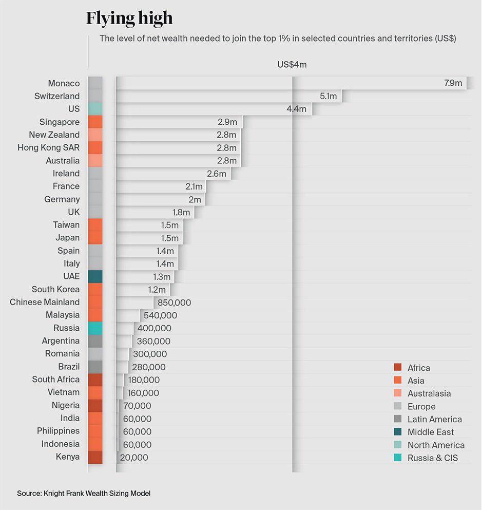 Level of well-being required to be in the top 1% of the richest residents of their country, USD