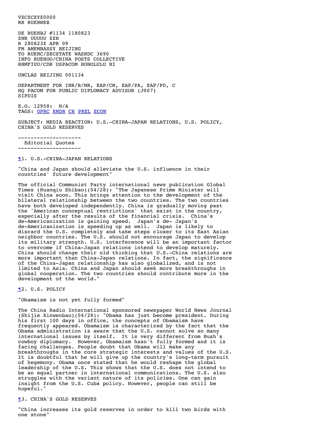 Date:2009 April 28, 08:23 (Tuesday) Canonical ID:09BEIJING1134_a UNCLAS BEIJING 001134 DEPARTMENT FOR INR/R/MR, EAP/CM, EAP/PA, EAP/PD, C HQ PACOM FOR PUBLIC DIPLOMACY ADVISOR (J007) SIPDIS E.O. 12958: N/A TAGS: OPRC,…