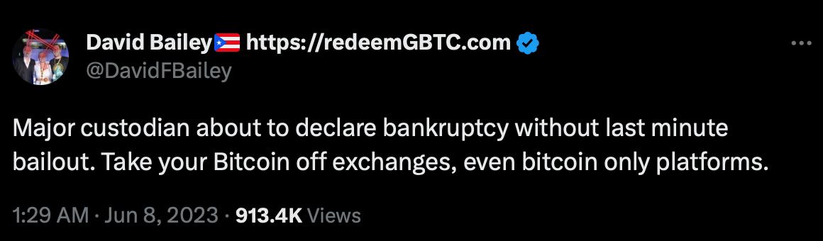 Bitcoin Magazine CEO David Bailey on Twitter warned of the imminent bankruptcy of one of the largest cryptocurrency custodians. “Major custodian about to declare bankruptcy without last minute bailout. Take…