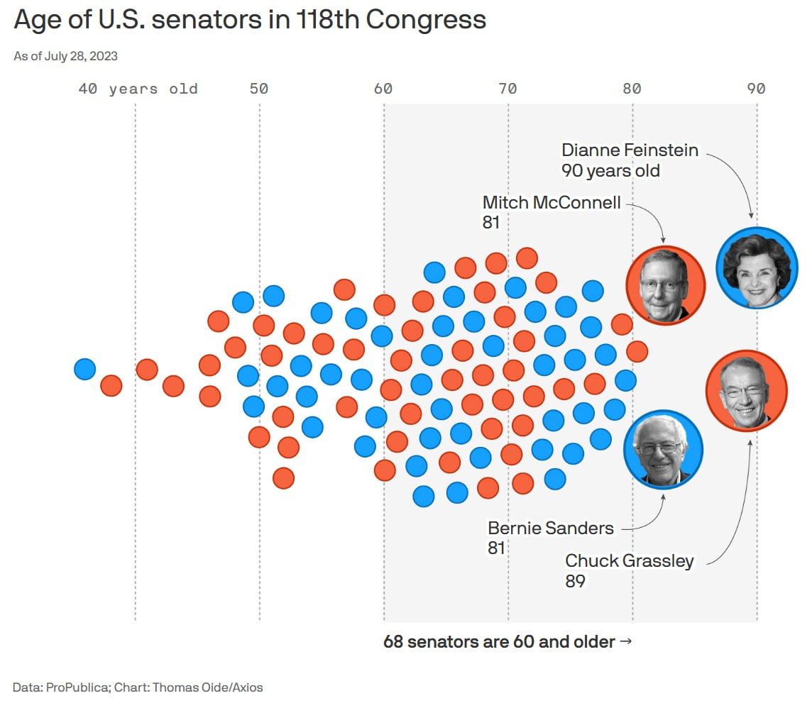 The US leadership is getting older: the Senate’s average age is 64, while the House of Representatives has an average age of 57, Axios calculated. Congress overall is made up…