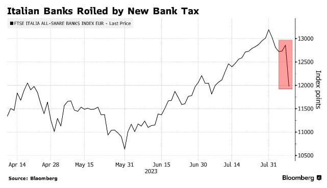 Italy has approved a one-time 40% tax on profits earned by banks from rising interest rates and plans to use the money to help mortgage holders, sending bank stocks tumbling.…