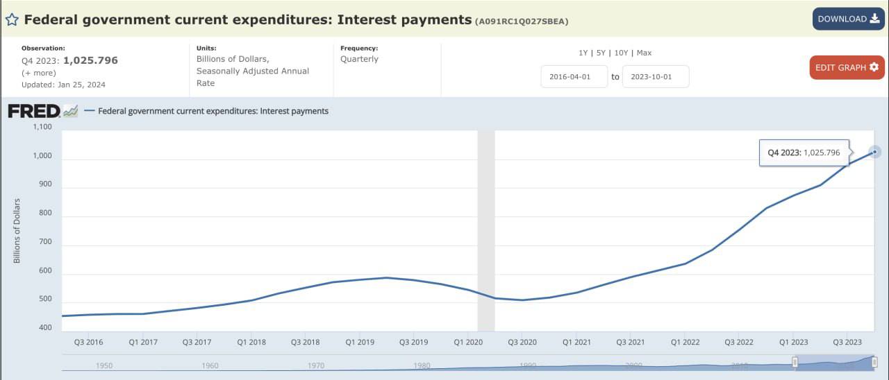 Interest payments on the U.S. national debt have reached the level of one quarter’s federal budget revenue. In other words, American taxpayers effectively work for three months each year solely…