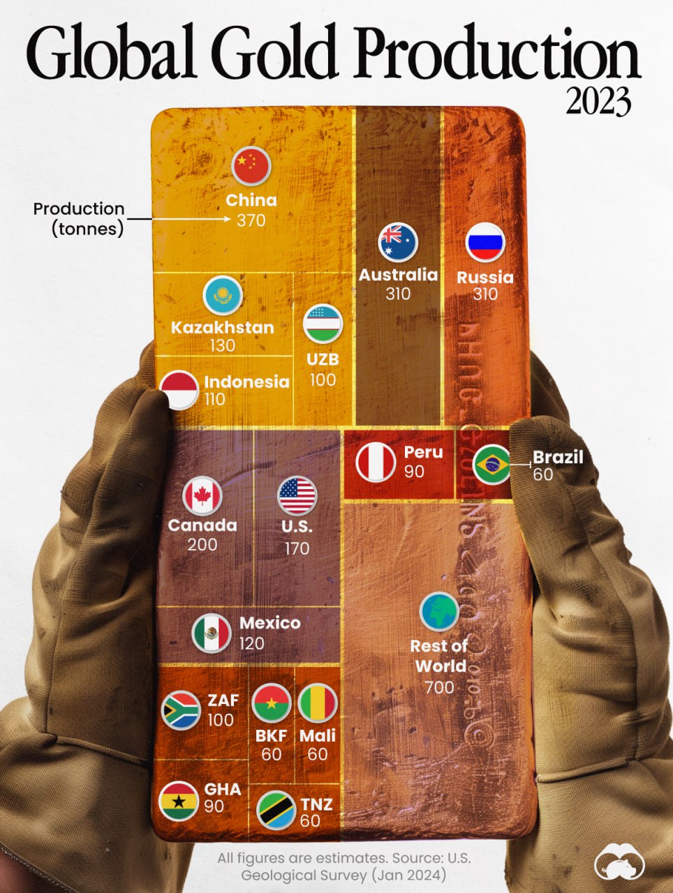 In 2023, the world produced over 3,000 tons of gold, with China, Australia, and Russia being the top producers. China was the largest producer, accounting for more than 12% of…