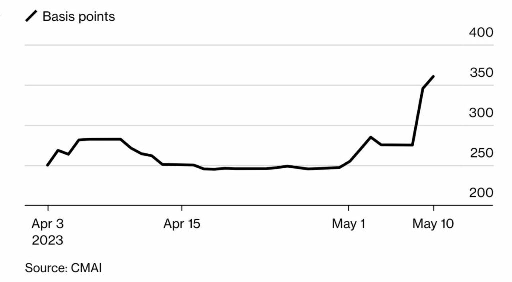 The swaps this week had their biggest increase since UBS Group AG agreed to buy Credit Suisse in an emergency weekend deal in March. As part of that acquisition, Swiss regulators forced the wipeout of about $17 billion of so-called Additional Tier 1 notes. The swaps have jumped 85 basis points this week to 360 basis points, according to CMAI data.