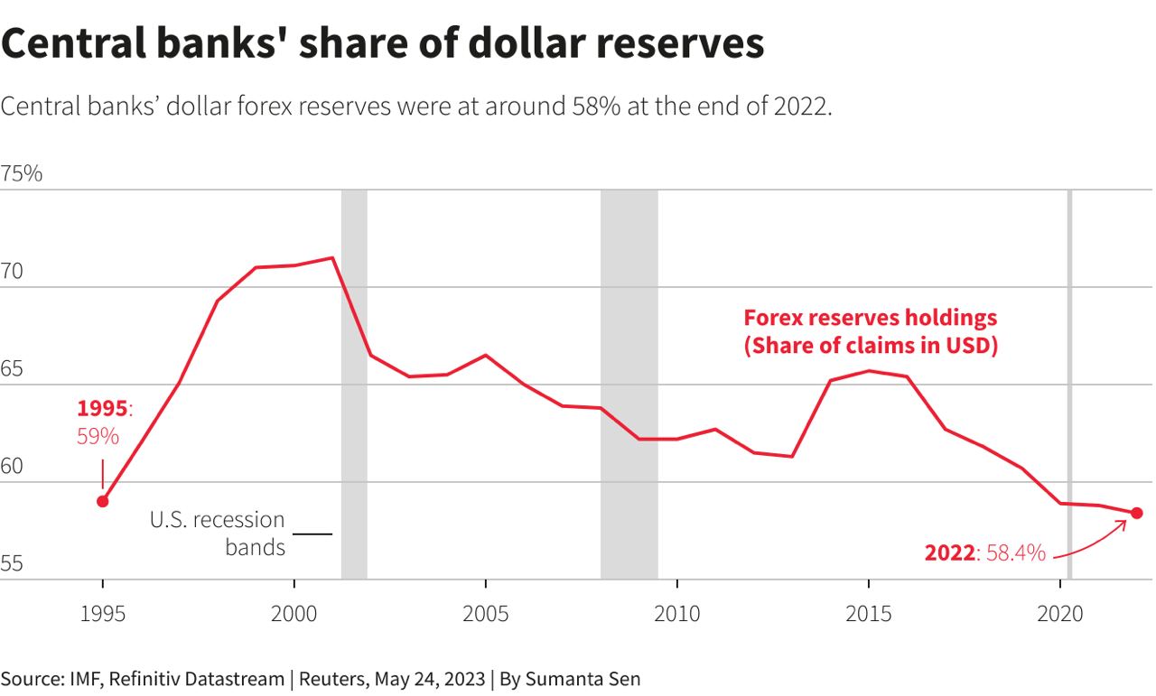 The dollar share of official FX reserves fell to a 20-year low of 58% in Q4 2022, according to the International Monetary Fund.