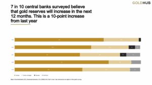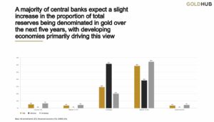 By contrast, their views towards gold’s future role grew more optimistic, with 62% saying that gold will have a greater share of total reserves compared to 46% last year.