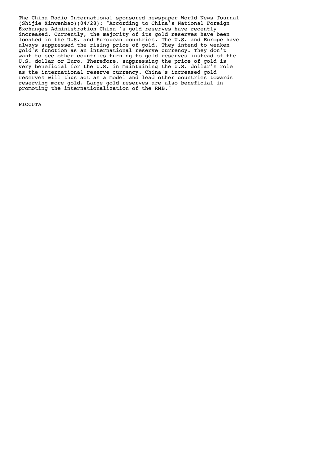UNCLAS BEIJING 001134 DEPARTMENT FOR INR/R/MR, EAP/CM, EAP/PA, EAP/PD, C HQ PACOM FOR PUBLIC DIPLOMACY ADVISOR (J007) SIPDIS E.O. 12958: N/A TAGS: OPRC, KMDR, CH, PREL, ECON SUBJECT: MEDIA REACTION: U.S.-CHINA-JAPAN RELATIONS, U.S. POLICY, CHINA’S GOLD RESERVES ——————– Editorial Quotes ——————– 1. U.S.-CHINA-JAPAN RELATIONS “China and Japan should alleviate the U.S. influence in their countries’ future development” The official Communist Party international news publication Global Times (Huanqiu Shibao)(04/28): “The Japanese Prime Minister will visit China soon. This brings attention to the development of the bilateral relationship between the two countries. The two countries have both developed independently. China is gradually moving past the ‘American conceptual restrictions’ that exist in the country, especially after the results of the financial crisis. China’s de-Americanization is gaining speed. Japan’s de- Japan’s de-Americanization is speeding up as well. Japan is likely to discard the U.S. completely and take steps closer to its East Asian neighbor countries. The U.S. should not encourage Japan to develop its military strength. U.S. interference will be an important factor to overcome if China-Japan relations intend to develop maturely. China should change their old thinking that U.S.-China relations are more important than China-Japan relations. In fact, the significance of the China-Japan relationship has also globalized, and is not limited to Asia. China and Japan should seek more breakthroughs in global cooperation. The two countries should contribute more in the development of the world.” 2. U.S. POLICY “Obamaism is not yet fully formed” The China Radio International sponsored newspaper World News Journal (Shijie Xinwenbao)(04/28): “Obama has just become president. During his first 100 days in office, the concepts of Obamaism have frequently appeared. Obamaism is characterized by the fact that the Obama administration is aware that the U.S. cannot solve so many international issues by itself. It is very different from Bush’s cowboy diplomacy. However, Obamaism hasn’t fully formed and it is facing challenges. People doubt that Obama will make any breakthroughs in the core strategic interests and values of the U.S. It is doubtful that he will give up the country’s long-term pursuit of hegemony. Obama once stated that he would reshape the global leadership of the U.S. This shows that the U.S. does not intend to be an equal partner in international communications. The U.S. also struggles with the variant nature of its policies. One can gain insight from the U.S. Cuba policy. However, people can still be hopeful.” 3. CHINA’S GOLD RESERVES “China increases its gold reserves in order to kill two birds with one stone” The China Radio International sponsored newspaper World News Journal (Shijie Xinwenbao)(04/28): “According to China’s National Foreign Exchanges Administration China ‘s gold reserves have recently increased. Currently, the majority of its gold reserves have been located in the U.S. and European countries. The U.S. and Europe have always suppressed the rising price of gold. They intend to weaken gold’s function as an international reserve currency. They don’t want to see other countries turning to gold reserves instead of the U.S. dollar or Euro. Therefore, suppressing the price of gold is very beneficial for the U.S. in maintaining the U.S. dollar’s role as the international reserve currency. China’s increased gold reserves will thus act as a model and lead other countries towards reserving more gold. Large gold reserves are also beneficial in promoting the internationalization of the RMB.” PICCUTA