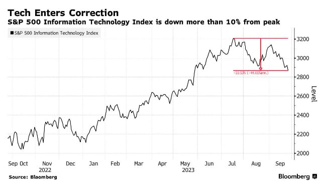 The major selloff came in the technology sector, where a strong decline sent the S&P 500 Information Technology Index down more than 10% from its July high.