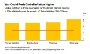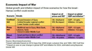 In that scenario oil prices could soar to $150 a barrel and global growth drop to 1.7% – a recession that takes about $1 trillion off world output.