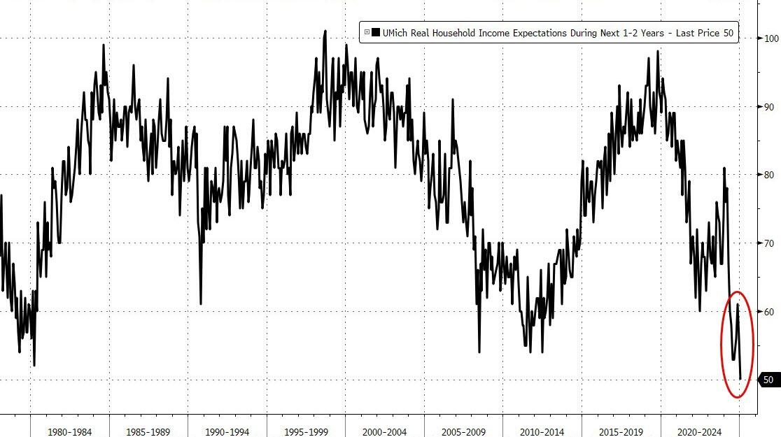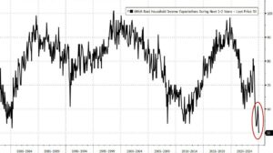 The chart below shows that the University of Michigan survey of real household income expectations is plummeting.