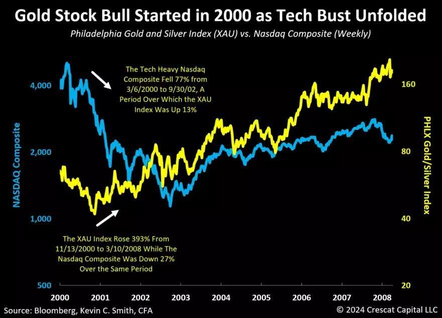 Over a longer stretch, from Nov 2000 to March of 2008, XAU rose 393% while the Nasdaq Composite fell 27%. As tech fell apart, gold and silver offered relief from the pain.